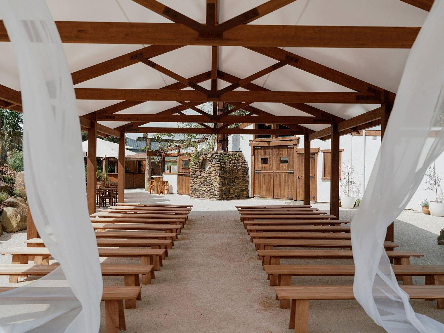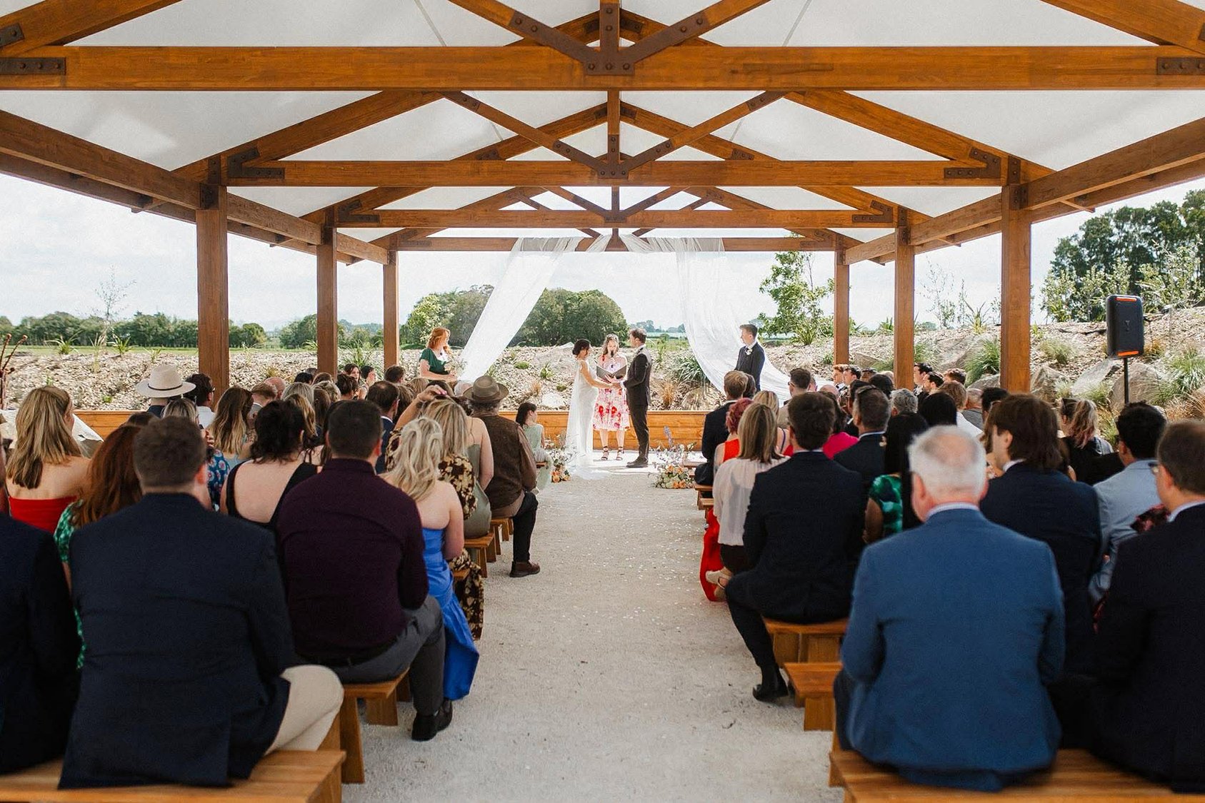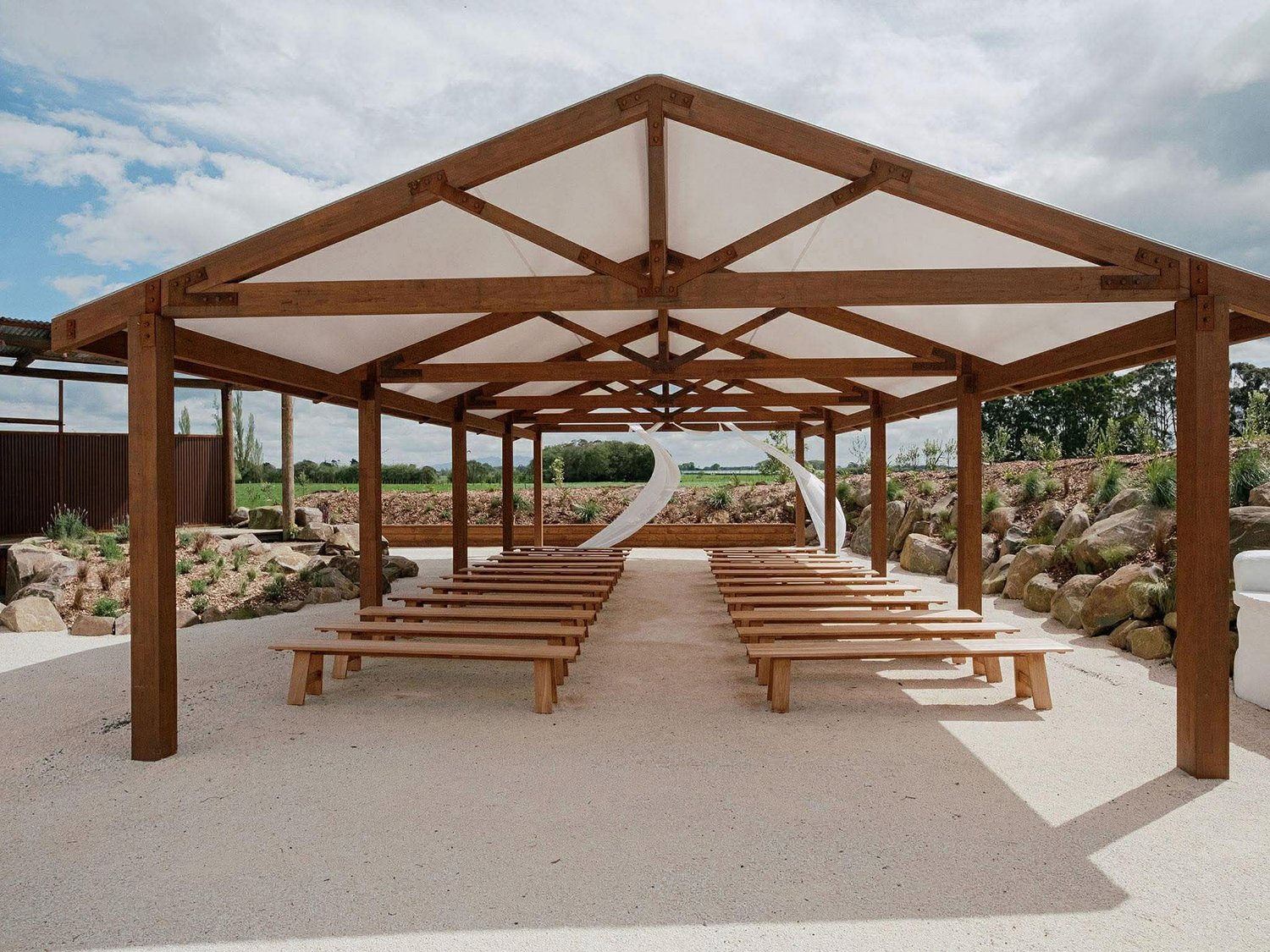 The completed tensile roof has transformed the timber structure into a permanent, all-weather ceremony space. The area now serves as both a dedicated wedding ceremony location and an adaptable space for additional seating during events. The project has been highly successful, enhancing both the functionality and visual appeal of Eden Venues while delivering a durable, long-term roofing solution.